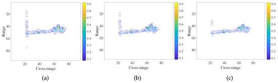 Figure 7 shows the imaging results of 25% measurements of plane data, using the GKF, ONDL, and OFDL, as well as our GDL-imaging methods, respectively. Figure 8 shows the imaging results of 50% measurements of plane data. Figure 9 shows the imaging results obtained by ship raw data, using the different imaging methods mentioned above. Note that all imaging results are displayed with the same contour level.