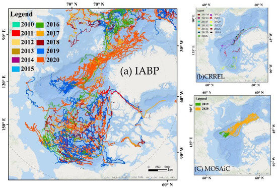 The trajectories of all of the buoys used in this study, and only those buoys with trajectories to the north of 70° N were utilized. (a) The trajectories of the IABP buoys during 2010–2020; (b) the trajectories of the MOSAiC buoys during 2019–2020; and (c) the trajectories of the CRREL buoys during 2010–2016.