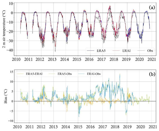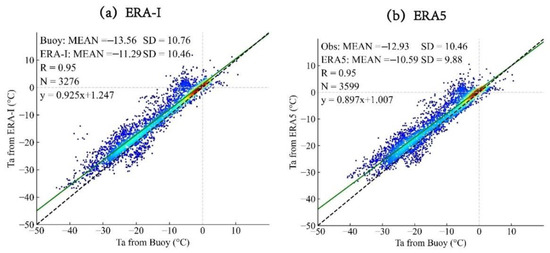 Large differences between the ERA-I and ERA5 have also been found in previous buoy comparisons, reaching more than 4 °C. Further comparisons have indicated that the biases were larger when the air temperature was less than −25 °C [35].