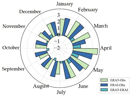 Figure 4 shows the monthly mean biases of the Ta between the reanalysis datasets and the buoy observations. In general, the biases were warm for both ERA-I and ERA5 in all of the months, and the largest biases occurred in April (3.02 ± 2.79 °C for ERA-I and 3.73 ± 2.84 °C for ERA5; Table 3). The biases were relatively small in August, September, October, and November, i.e., less than 2 °C. The monthly differences between the ERA5 and ERA-I exhibited seasonal variations, with negative differences occurring in the warm season (July, August, and September) and positive differences occurring in the other months. The largest negative difference was −0.36 ± 0.80 °C in July, and the largest positive bias was 1.17 ± 1.79 °C in March (Table 3).