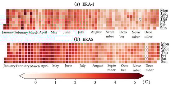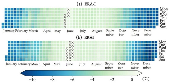 The calendar diagram of the daily Ta biases for (a) ERA-I and (b) ERA5 based on the multi-year mean. The symbol “X” denotes the days with negative biases.
