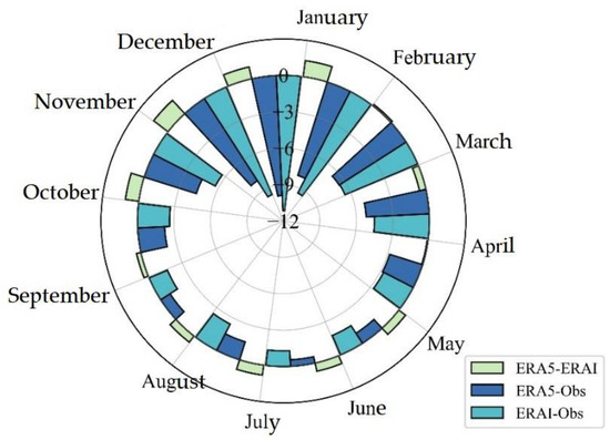Figure 8 shows the seasonal changes in the biases between the ERA5, ERA-I, and buoy observations. Both the ERA5 and ERA-I exhibited cold biases for all of the months when compared with the buoy observations. The Ts from ERA5 exhibited warmer biases for most of the period, except for March and April, when compared with ERA-I. The cold biases (greater than −6 °C) usually occurred in the cold season (November, December, January, and February), and the largest bias occurred in December, exceeding −10 °C for both reanalysis datasets. However, in the warm summer, the biases were usually rather small, less than −3 °C from April to October.
