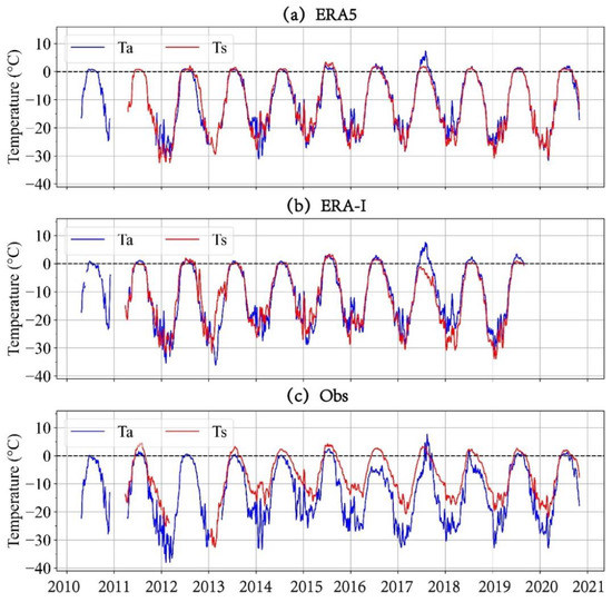 The comparisons of the daily mean Ta and Ts values from (a) ERA5, (b) ERA-I, and (c) the buoy observations during 2010–2020.