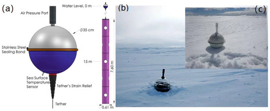 (a) Illustration of a typical IABP buoy, with a surface temperature sensor near the bottom [50], Adapted with permission from ref. [50], Copyright 2019, Luca R. Centurioni. Field photos of an IABP buoy frozen in the Arctic sea ice, with (b) thick snow and (c) thin snow.