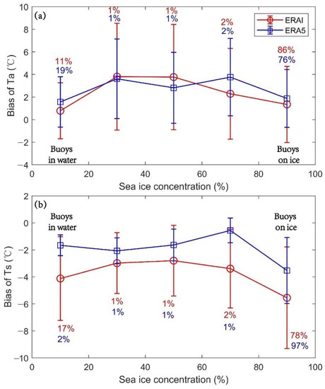 The Ta (a) and Ts (b) biases in the different SIC (sea ice concentration) ranges. The red lines and blue lines represent the ERA-I and ERA5, respectively. The red and blue numbers represent the percentages of the buoys used in the calculations.