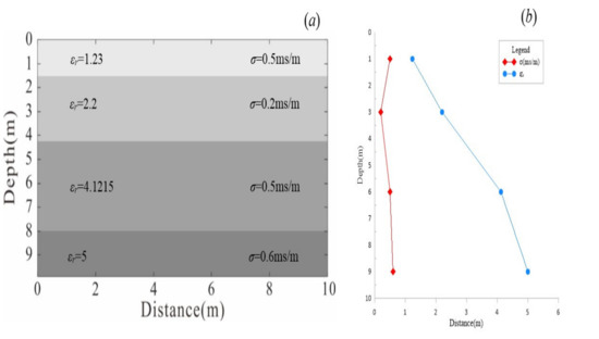 Table 2. The transit time for 2.6 m of travel is 40 to 60 ns. This may indicate that the geological structure is a clay material with some water saturation. Otherwise, consider a dry sand ε = 5 with conductivity σ = 5 mS/m. The expected velocity is 0.15 m/ns, and the attenuation is 3.8 dB/m which corresponds to a distance of 26–27 m for 100 dB of attenuation and a travel time of 100ns or longer due to the presence of reflectors from 100 to 150 ns. This example might correspond to dry sedimentary rocks, such as divisions in clay, compact clay, and sandstone. From the above observations, we divided our site into three layers containing freshwater in their pore spaces. The results of the experiments become less valid as conditions vary from the initial assumptions (i.e., σ > 10 mS/m and µ ≠ 1) due to the dispersive effect of conductivity and the added influence of relative magnetic permeability on wave propagation.