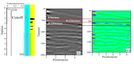 From the following analysis, we determined the velocity cut-off point. The precision of the radar wave’s velocity and the TWT at zero offsets were then estimated from the picked TWT data by using Student’s t-test at the 95% confidence limit [