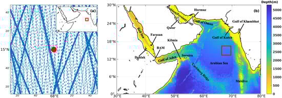 (a) Spatial distribution of satellites’ sampling. The position of the selected window is shown on the top right corner, indicated by the red box. Blue dots show the satellite observation points, and the “line segments” actually are built up by dense dots. The red point is the central point of this window. (b) Topography of the Arabian Sea. The main locations involved in this study are indicated.