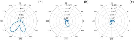 An example is shown in Figure 2, describing the relationship between the amplitudes of internal tides and their propagation directions for the fitting window ranging from 14.2°N to 15.8°N and 67.2°E to 68.8°E. The first step was to divide the window into 360° degrees and apply Equation (3) over the whole window data for each degree. Thus, each angle corresponds to one fitting with an amplitude and a phase . Figure 2a outlines the relationship between angle and amplitude, which represents the three most significant internal tides. The most prominent signal in this window appears along (Wave 1), which is regarded as the largest internal tide at (15°N, 68°E). The second step is to extract the second largest internal tides (Wave 2) from Figure 2a. Note that the influence of Wave 1 is observed not only along 225°, but also along other directions, so the contribution of Wave 1 must be removed. Equation (3) was used again to predict the SSH generated by Wave 1, considering the amplitude and phase of Wave 1 were known from Figure 2a. Then this prediction was subtracted from the original data, as shown in Figure 2b. The third step is to repeat the above process to extract the third significant wave, as shown in Figure 2c. After completing the calculation for one fitting window, these operations are extended to the entire domain with a step of .