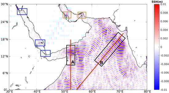Snapshot of mode-1 internal tides’ SSH at 00:53:20, 5 November 2015. Two primary generation sources of internal tides are suggested: Kilmia Island and the western India Peninsula, indicated by Rectangles A and B. The color represents the positive and negative values of the SSH. The three blue boxes indicate the generation locations of internal tides in the Red Sea. The red lines represent the locations of the profiles shown in Figure 4 along the internal tides’ propagation direction.