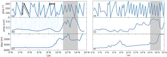 The phase distribution along Line A is shown in Figure 4a. Here, two black arrows indicate the northward direction of propagation, in which case, the phase gradually increases from to and then sharply drops to 0. However, not all the phase falls rapidly. Although only the maximum wave was considered, the waves along Line A may have originated from different sources. Figure 4b,c shows the amplitude and bathymetry along the same transect. Note that the gray shading represents the area with significant internal tides, located between 11°N and 15°N and peaking around 13°N. Similarly, Figure 4d–f illustrates the same properties along the red Line B. The amplitude along this line reaches 0.77 cm at 17°N, and the consistency between the steepness of the topography and the amplitude suggests that the internal tides are generated from the area with steep topography.