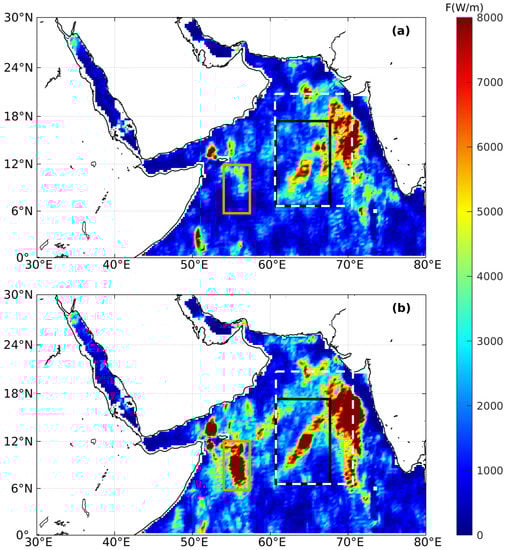 Long-term average vertically integrated energy flux in (a) summer and (b) winter, respectively. There are more hotspots during winter: the northeastern Arabian Sea, the Maldive Islands, the Gulf of Oman, and the southern Red Sea. The black box indicates the area of Figure 8a–c; the orange box indicates the area of Figure 8d–f; and the white box indicates the area of Figure 9.