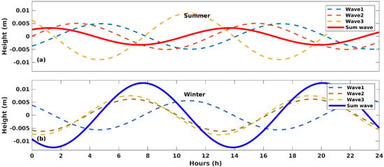 The 24 h time series of waves at Point P in summer (a) and winter (b). The dashed lines represent the three waves at Point P. The solid lines are the sum of the three.