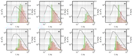 Frequency spectra, , (solid line) and distributions of whitecap coverage over frequency, , for (red bars) and for (green bars) for all experimental runs.