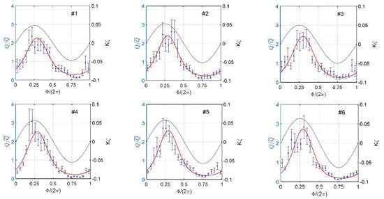 Normalized amplitudes (a,b) and phase shifts (c) of the first two harmonics in (A1) as a Figure A2a–c and curve (d). Red lines show model calculations for mean data characteristics m/s and .