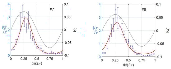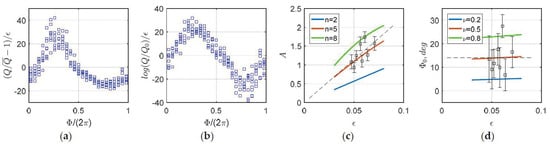 Figure 5a,b, combining all the data, demonstrate better applicability of nonlinear description (2) for data fitting using a sinusoid. Moreover, nonlinear description (2) appears to be inherent in our data, as confirmed in Appendix A. Fitting the with , we obtain that an increase in leads to linear growth of remaining constant, see Figure 5c,d. Least-square estimates gives:
