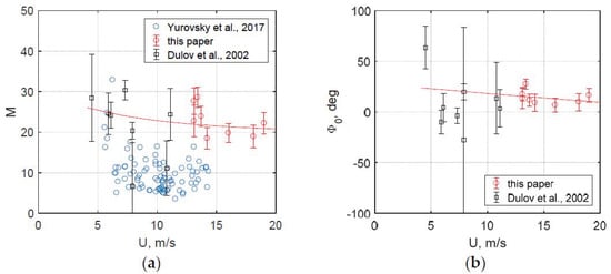Figure 6 shows wind dependences of modulation parameters. The results of [35,37] obtained using linear representation (1) are also shown for comparison. Though wind dependences are weak, the same trends are evident for all the datasets. Some bias of estimations [37] is probably caused by residual foam, which was not completely removed in their study, and accounting for small-scale, microwave breaking.