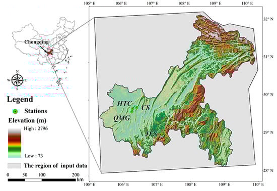 Chongqing is located in southwest China, between 105°11′–110°11′ E and 28°10′–32°13′ N (Figure 1). The climate is subtropical humid, with a mean annual rainfall of 1240.9 mm and an average annual temperature of 14.6–15.6 °C. It has complex topographic features with elevation changing from 73 to 2796 m. The western Chongqing is located in the Sichuan Basin, and the east gradually uplifts eastward. As an inland city, Chongqing is characterized by its cloudy and foggy weather. The statistics based on MODIS daily observations in 2018 indicate that the number of the days with valid values for each pixel in this region accounts for 38 to 135. Therefore, it is a good place to evaluate the LST reconstruction study. To obtain more valid pixels for modeling, the study area was extended to cover the whole Chongqing city as shown in Figure 1.
