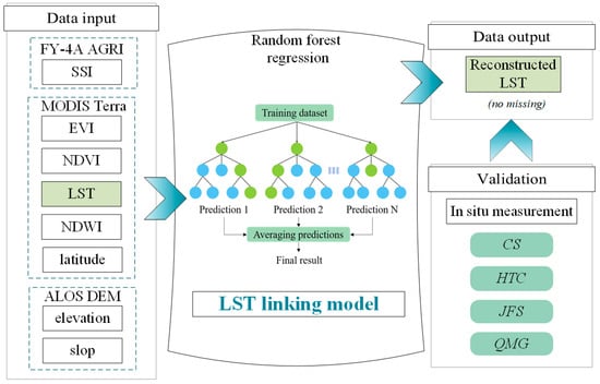 All these methods can reconstruct the theoretical clear-sky LSTs values rather than the actual LSTs which are normally influenced by cloud cover, so Zhao and Duan [] developed a novel approach for recovering the cloud-affected LSTs for MODIS daily observations using a random forest (RF)-based approach. The major innovation of this method was the use of the downward shortwave radiation flux (DSSF) product from Meteosat Second Generation (MSG) geostationary observations to describe the effect of cloud cover on LST. Because of the high time resolution of MSG products, it can well reflect the influence of the cumulative radiation factor in the area covered by clouds. With this solar radiation factor and other environmental factors as the predictor variables, this method was fitted by RF regression method with clear-sky pixels and then applied to the cloudy pixels to estimate the actual LST. As a machine learning method, it represented the interaction between LST and the most relevant LST influencing variables, and it was relatively simple for this approach to fit reconstruction functions. Moreover, a visual inspection, using Global Land Data Assimilation System NOAH LST data and ground-based air temperature data partly confirmed the reliable performance of the reconstructed LST. However, a direct validation with ground-based LST measurements was lacking in this study.