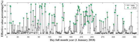 Percentage of MODIS LST pixels with valid values in the study area and their change with the day of the year.