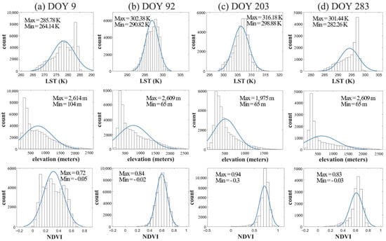 Histogram profiles of LST, elevation and NDVI on four days in 2018 (DOY 9, DOY 92, DOY 203 and DOY 283).