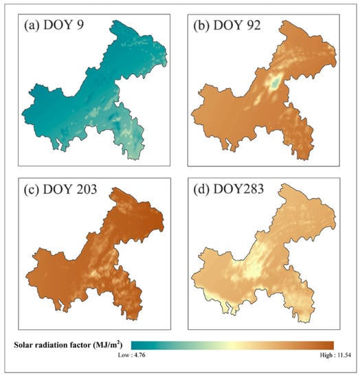 Estimated solar radiation factor on four days in 2018 (DOY 9, DOY 92, DOY 203 and DOY 283).