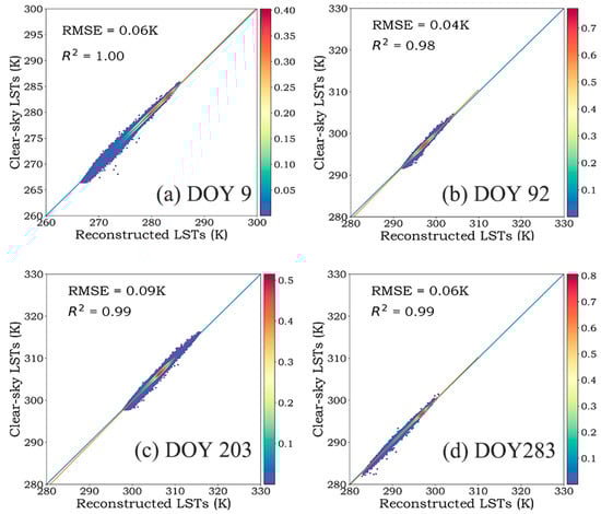 Figure 10 shows the reconstructed LSTs versus in situ measurements of four sites after removing the systematic biases. The scatter plot generally shows that the reconstructed LSTs at these four sites have a good correlation with the in situ data with an R2 value of 0.89 and the ubRMSE of 2.63 K. Additionally, most of the reconstructed LST values are concentrated near the 1:1 line, which demonstrates that the reconstructed LSTs have a good agreement with the original LSTs, and this method provides a reliable, robust filling result. Although the R2 is slightly lower than the comparison for cloud-free LST pixels, the bias is a little smaller according to the absolute value.