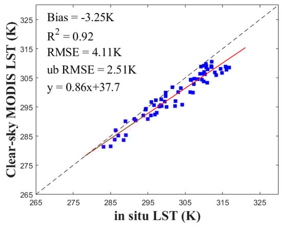 Scatter plot of the clear-sky MODIS LST versus in situ measurements.