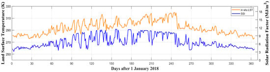 The in situ LST and estimated solar radiation factor over the CS site and their change with the day of the year.