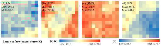 Prior to the validation of the reconstructed LSTs, the spatial standard deviation (STD) of LSTs was calculated using a subset of 11 × 11 ASTER pixels corresponding to the MODIS pixel centered on each site []. The STDs of HTC and JFS sites are considerably larger than that of the other two sites shown in Table 2. However, all sites have a spatial STD lower than 1.7 K; therefore, they can be considered relatively homogeneous and can be used to directly validate the LSTs at MODIS scale.