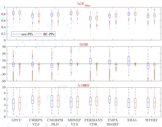 In this Section, the PPs and BC-PPs are compared with the gauge-observed precipitation over 1382 catchments for the 1998-2015 period. Figure 2 presents the performances in terms of the R calculated for 3-day means (R3day), RB and RMSE. It shows that GPCC is superior to other PPs in terms of both R3day (median: 0.83) and RMSE (median: 4.54), and the absolute RB (median: 2.40) which is only larger than that of MSWEP V2.0 (median: 0.81). The good performance of GPCC is in line with the study of Schneider, Becker [], and is attributed to it is the largest gauge-based dataset, with data collected from more than 70,000 different stations worldwide []. Note that the use of R3day can only reduce but cannot completely eliminate the impact of reporting time issues. Therefore, it is possible that the good performance of GPCC is also attributed to the similar time shifts between the reference observations and GPCC. The MSWEP V2.0 appears to perform better than the remaining six PPs in terms of the median value of three indices (R3day of 0.82, absolute RB of 0.81, RMSE of 5.21), underscoring the effectiveness of merging multiple satellite and reanalysis datasets, which is in agreement with the finding of Beck and Vergopolan []. The ERA5 performs well in terms of R3day (median: 0.80) and RMSE (median: 4.92) but attains the worst absolute RB (median: 7.89). The larger relative biases in precipitation estimates from ERA5 are inconsistent with the findings of Jiang and Li []. The MSWEP V2.0, GPCC and CHIRPS V2.0 attain better RB scores, which are attributed to the use of gauge-based Climate Hazards Center’s Precipitation Climatology (CHPclim) dataset [] or Global Climate Data (WorldClim) [] to determine their long-term mean. The median scores of R3day, absolute RB and RMSE for the eight BC-PPs are 0.67~0.83, 0.07~3.12, and 4.84~5.63, respectively, which shows generally better performance than that from the eight raw-PPs.