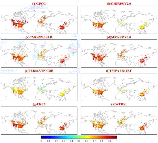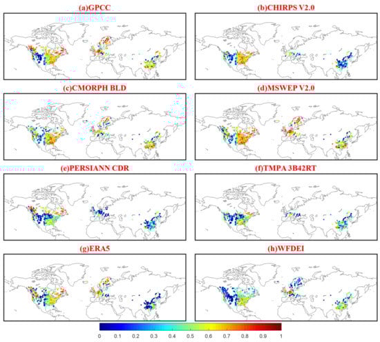 Spatial patterns of the R calculated for 3-day means (R3day) for the eight PPs ((a) GPCC, (b) CHIRPS V2.0, (c) CMORPH BLD, (d) MSWEP V2.0, (e) PERSIANN CDR, (f) TMPA 3B42RT, (g) ERA5, (h) WFDEI) using gauge-observed precipitation from 1382 catchments as a reference. Each data point represents a catchment centroid.