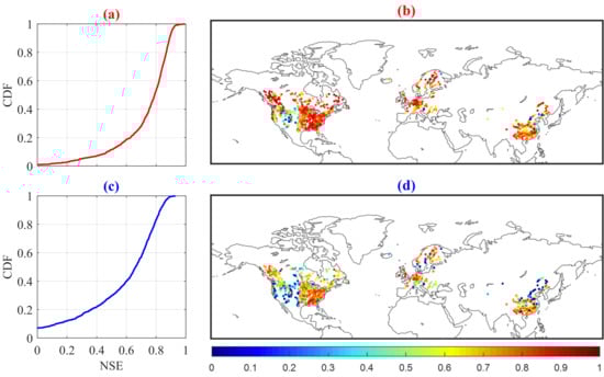 Spatial pattern and Cumulative Distribution Function (CDF) of NSE obtained by running XAJ with gauge-observed precipitation over 1382 catchments. (a,b) are for the calibration period, (c,d) are for the validation period.