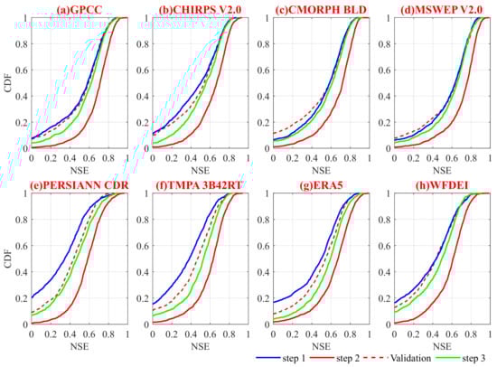 Cumulative Distribution Function (CDF) of NSE obtained by running XAJ with the eight PPs ((a) GPCC, (b) CHIRPS V2.0, (c) CMORPH BLD, (d) MSWEP V2.0, (e) PERSIANN CDR, (f) TMPA 3B42RT, (g) ERA5, (h) WFDEI) over 1382 catchments based on 3 steps of hydrological modeling. The dash line refers to the validation when PPs-specific calibration is used.