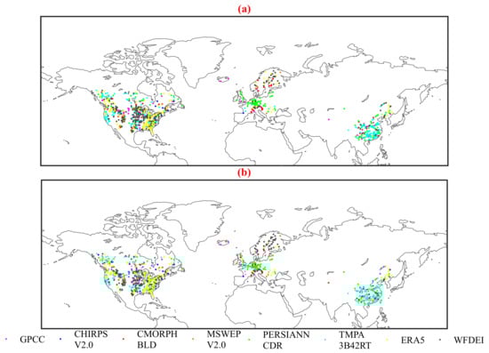 Satellite-related datasets use polar-orbiting passive microwave (PMW) sensors on low-Earth-orbiting satellites and geosynchronous infrared (IR) sensors on geostationary satellites to estimate precipitation [,], and usually blend rain gauge data to offset their limited abilities []. In specific, PERSIANN CDR and TMPA 3B42RT mainly respectively applied IR data and PMW data, while the other three integrated both IR and PMW data. MSWEP V2.0 and CMORPH BLD directly incorporated daily gauge data, CHIRPS V2.0 incorporated 5-day gauge data, and TMPA 3B42RT and PERSIANN CDR incorporated monthly gauge data.