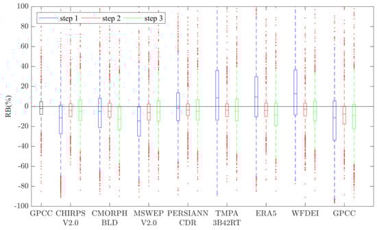 In addition, RB is used to further explore whether the PPs can be used to estimate the annual streamflow and the results are shown in Figure 8. The RB derived from gauge-observed precipitation (Obs) is also displayed, which provides a satisfied estimation for the annual streamflow with a slight underestimation. The MSWEP V2.0 with the highest NSE values (median: 0.63) has the lowest error in annual streamflow (median: −1.63). The good performance of MSWEP V2.0 in terms of both NSE and RB indicate that we can use MSWEP V2.0 as an alternative precipitation data source for hydrologic modeling when facing a lack of gauge precipitation observations. For the eight PPs, the median values of absolute RB in step 2 (mean: 4.57) and step 3 (mean: 6.94) are lower than that in step 1 (mean: 9.32). This demonstrates that specific calibration and bias correction can effectively improve the abilities of the PPs in the annual streamflow estimates.