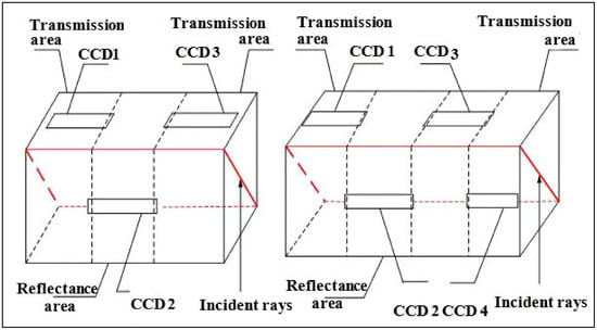 The optical butting scheme arranges multiple chips as an equivalent, long-line CCD array through an optical mirror. Ideally, the misalignment of each chip along the orbit direction is zero allowing the formation of a continuous straight line on the focal plane, which results in few difficulties in the subsequent mosaic process. The main disadvantages of this include light energy reduction and chromatic aberration from prism splitting and limitations of the stitching length due to the prism material and manufacturing technology. One typical example is the three-line array camera in the ZY-3 satellite, whose nadir-view camera is stitched by three TDI CCD chips, and the front-view and backward-view cameras are stitched by four TDI CCD chips, as shown in Figure 1. Through use of the optical mirror, the optical butting scheme divides the imaging space into the transmission area and the reflectance area, which are separate in space. In the ZY-3 nadir-view camera, TDI CCD chips CCD1 and CCD3 are arranged in the transmission area. TDI CCD chip CCD2 is arranged in the reflectance area. In the ZY-3 front-view and backward-view cameras, TDI CCD chips CCD1 and CCD3 are arranged in the transmission area. TDI CCD chip CCD2 is arranged in the reflectance area in both cameras. The TDI CCD chips in both the transmission area and the reflectance area form an equivalent, long-line CCD array on the focal plane through the optical mirror.