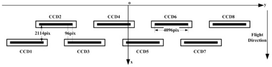 The mechanical interleaving scheme installs multiple CCD, CMOS, or TDI CCD chips into two staggered row configurations on the stitching plate mechanically. The advantage of this is that no additional chromatic aberrations are introduced in imaging, while the disadvantage is that a continuous straight line cannot be formed on the focal plane. The larger the mechanical misalignment, the greater the imaging time delay and the greater the difficulties involved in the subsequent geometric processing. IKONOS, QuickBird, LandSat-8, WorldView-2, French SPOT 6/7, and Chinese TH-1 have all adopted this kind of splicing scheme. Figure 2 shows the focal plane assembly diagram of a 2 m high-resolution (HR) camera in TH-1, which has eight multi-chip CCDs. In Figure 2, each chip contains 4096 photosensitive detector units. The number of overlapping units between adjacent CCDs is constant: 96 overlapping units. For example, the number of overlapping units between CCD1 and CCD2 is 96 units, that of CCD2 and CCD3 is also 96 units, and it is the same for CCD3 and CCD4, CCD5 and CCD6, and CCD7 and CCD8. Along the orbit flight direction the staggering misalignment between two rows is 2114 pixels.