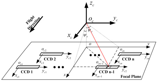 In Figure 4, oci-xciyci is the single-chip system in the focal plane. Each single-chip system takes the center of the left detector unit as the origin, the orbit flight direction as the xci axis, and the scanning direction as the yci axis. oc-xcyczc represents the camera system, and o-xy represents the focal plane system.