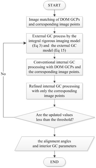 Steps 2 to 4 are repeated iteratively until the generated values for the alignment angles and interior geometric calibration parameters are less than the predefined threshold.