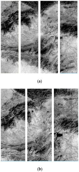 Due to the multi-chip placement position difference on the focal plane, the spliced satellite optical camera does not instantaneously generate a continuous straight line on the ground but instead obtains multiple discontinuous “short scanning lines”, as shown in Figure 3a. The alignment difference in the discontinuous short scan lines along the orbit flight direction depends on the degree of multi-chip misalignment on the focal plane. Each chip acquires push broom images separately along the satellite platform flight and forms multiple-segmented narrow strip images with certain horizontal overlap and vertical misalignment, as in Figure 3b.