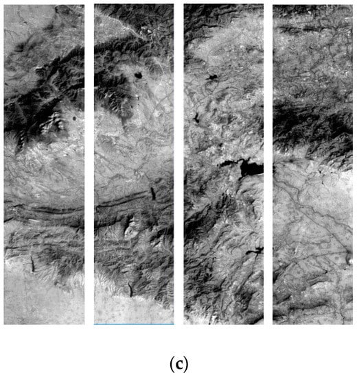 ZY-3 satellite three-line array test data. (a) 4 TDICCD overview images of the forward view; (b) 3 TDICCD overview images of the nadir view; (c) 4 TDICCD overview images of the backward view.
