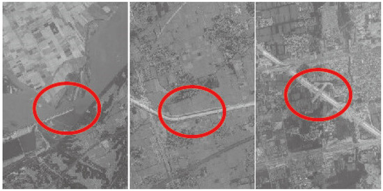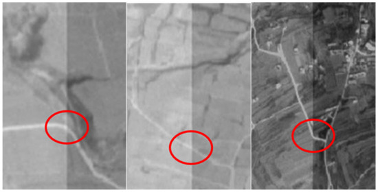The TH-1 HR satellite image used in the experiment was taken in 2019 and is shown in Figure 11. The TH-1 high-resolution satellite camera uses the mechanical interleaving imaging scheme, with about 2114 pixels displacement in the orbit flight direction among different chips. Noticeable dislocation can be observed at the junctions of roads and rivers in the image.