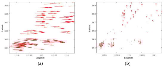 The positioning residuals distribution of ZY-3 three-line array camera after geometric calibration. (a) Positioning residuals in XY planar direction; (b) Positioning residuals in the elevation direction.