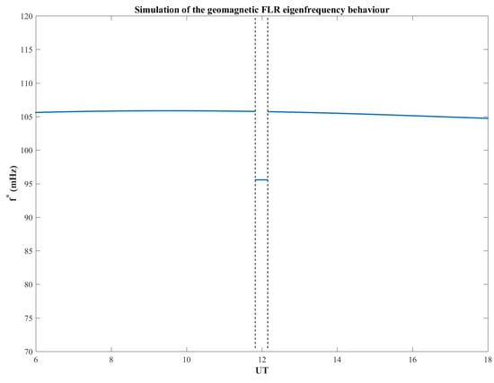 Figure 4 shows the modelled diurnal eigenfrequency behaviour of a field line footprinted at ( being the magnetic latitude). Around noon, we modified the plasma density at the footprint of the field line using a gradient pressure () which produces a density variation of lasting for about 10 min. Such is the result of the application of the M.I.L.C. model to an EQ characterized by a magnitude , a = 0.6 g and a = 20 s ( and being the Peak Ground Acceleration and time duration of the EQ, respectively). The M.I.L.C. model is based on the assumption that an EQ creates an acoustic gravity wave, which propagates through the atmosphere. The pressure gradient induced by the AGW causes local instability in the ionospheric plasma density distribution, giving rise to both plasma and EM waves propagating up to the magnetosphere. In general, it is well known that the concurring contribution of the EM wave energy and/or of the plasma density variation produces a change in the local FLR eigen-frequency [19,31,32]. Indeed, Figure 4 shows that our model is able to produce a clear collapse in correspondence to the plasma density gradient. This result is the consequence of Equation (A9) according to which any variation in the local magnetic field and/or in the local plasma density produces a corresponding change in . It is important to remind here that the use of the IGRF and the T01 model in solving Equation (A8) produces a maximum error in the evaluation of [23].