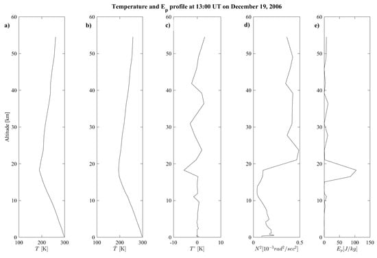 Example of AGW analysis. Vertical profiles of: (a) temperature; (b) background temperature; (c) temperature deviation, (d) square term of frequency, and (e) potential energy at 13:00 UT on 19 December 2006.