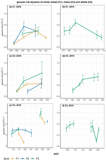 During 2018, for winter wheat (C1) (Figure 3a), the minimum (0.75 ± 0.11) and maximum (4.67 ± 0.95) values of ground-LAI were observed at the San Piero farm (F1), at DOY 84 and 109, respectively. Meanwhile, in 2019 (Figure 3b), the minimum (1.52 ± 0.33) and maximum (5.54 ± 0.68) ground-LAI values of C1 were observed at DOY 56 and DOY 106 at the Coltano farm (F3), respectively.