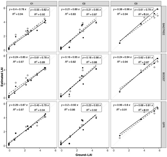 Validation results of LAI estimation at field level by GPR, BOOST, and BAGTREE. Results per crop (C1, C2, and C3) of the linear regression analysis between measured ground-LAI and LAI predicted from GPR, BOOST, and BAGTREE, according to the mixed-crop (MC) (dashed line on black dot and equation in the box) and crop-specific (CS) (continuous line on white dots) training data sets.