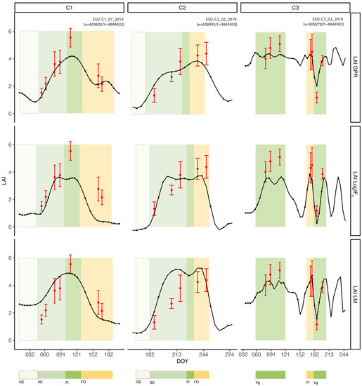 Temporal profile of LAI retrieved with GPR, LM, and LogIFd (black line), compared with the measured ground-LAI (red dots). Black lines represent the smoothed temporal profile of each crop using the GPR interpolation method, while black dots are the available S2 images. Red bars represent the standard deviation of ground-LAI. Different colored areas indicate the duration of each growth stage. In winter wheat (C1) and maize (C2), the growth stages are: from germination to full emergence (GE); stem elongation (SE); flowering (Fl); and fruit development (FD). In alfalfa (C3), the growth stages are: vegetative (Vg), occurring after mowing and flowering; and (Fl) occurring at full canopy development before mowing. In the x-axis, the day of the year (DOY) is depicted.