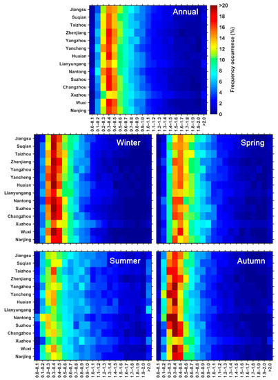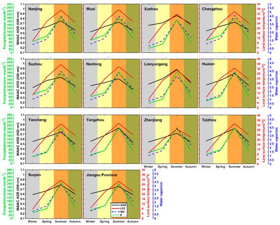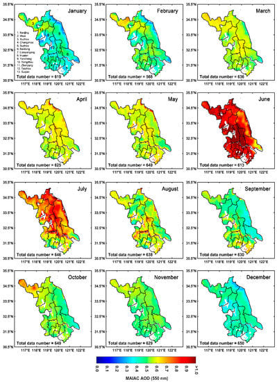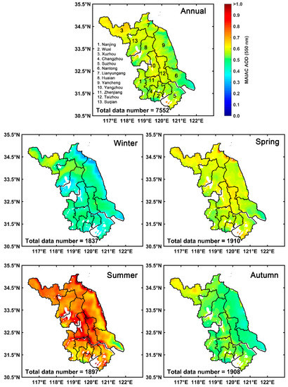 - The spatial distribution of seasonal mean AOD showed higher values in summer (>0.70) than in spring, autumn, and winter for most cities. In particular, the 21-year city-level summer mean AOD was highest in Lianyungang (0.89 ± 0.24) and lowest in Nantong (0.70 ± 0.18), whereas the spring mean AOD was highest in Xuzhou (0.71 ± 0.09) and lowest in Nantong (0.62 ± 0.08). The autumn mean AOD was also highest in Xuzhou (0.69 ± 0.12) and lowest in Nantong (0.48 ± 0.08), whereas winter AOD was highest in Xuzhou (0.66 ± 0.10) and lowest in Suzhou (0.51 ± 0.08). Furthermore, the spatial mean AOD peaked in June (>0.9) and was lowest in December (<0.4) throughout Jiangsu Province.